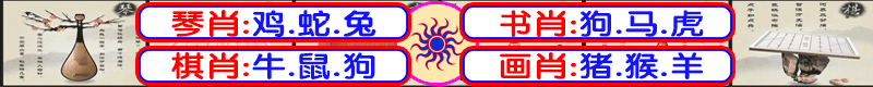 067期:琴棋书画【琴棋书】开:虎05对 068期:琴棋书画【画琴棋】开:猴23对 069期:琴棋书画【棋书画】开:羊24对 070期:琴棋书画【书画琴】开:马25对 071期:琴棋书画【画琴棋】开:羊48对 072期:琴棋书画【画棋书】开:鸡46错 073期:琴棋书画【棋画琴】开:鸡34对 074期:琴棋书画【棋琴书】开:發00对 (琴)鸡蛇兔(棋)牛鼠狗